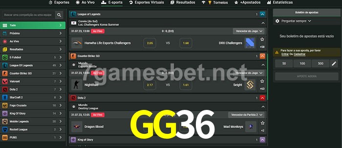 O GG36 oferece uma grande seleção de opções de apostas em e-sports com probabilidades competitivas
